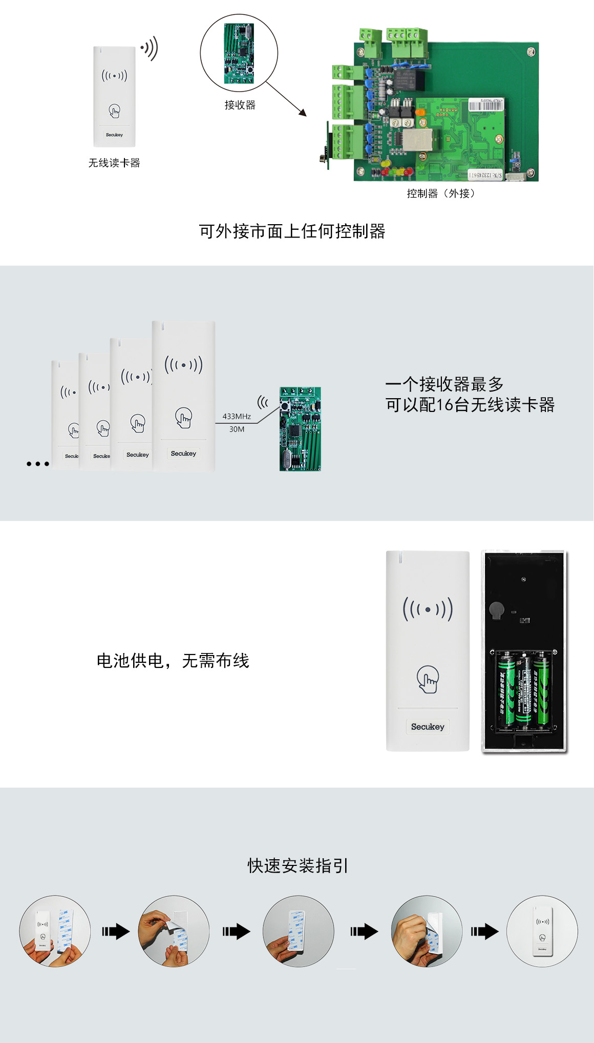 WR1由無線讀(dú)卡器(qì)和(hé)接≤≤收器(qì)組成,采用(yòng)的(de)是(shì)4≈α÷♦33MHz滾動碼通(tōng)訊技(jì)術(shù),接收器(qì)可(kě ≈β)以外(wài)接任何韋根控制(zhì)器(qì)!