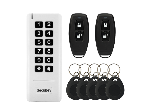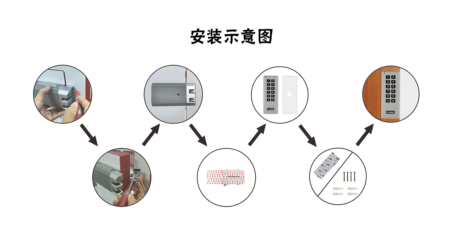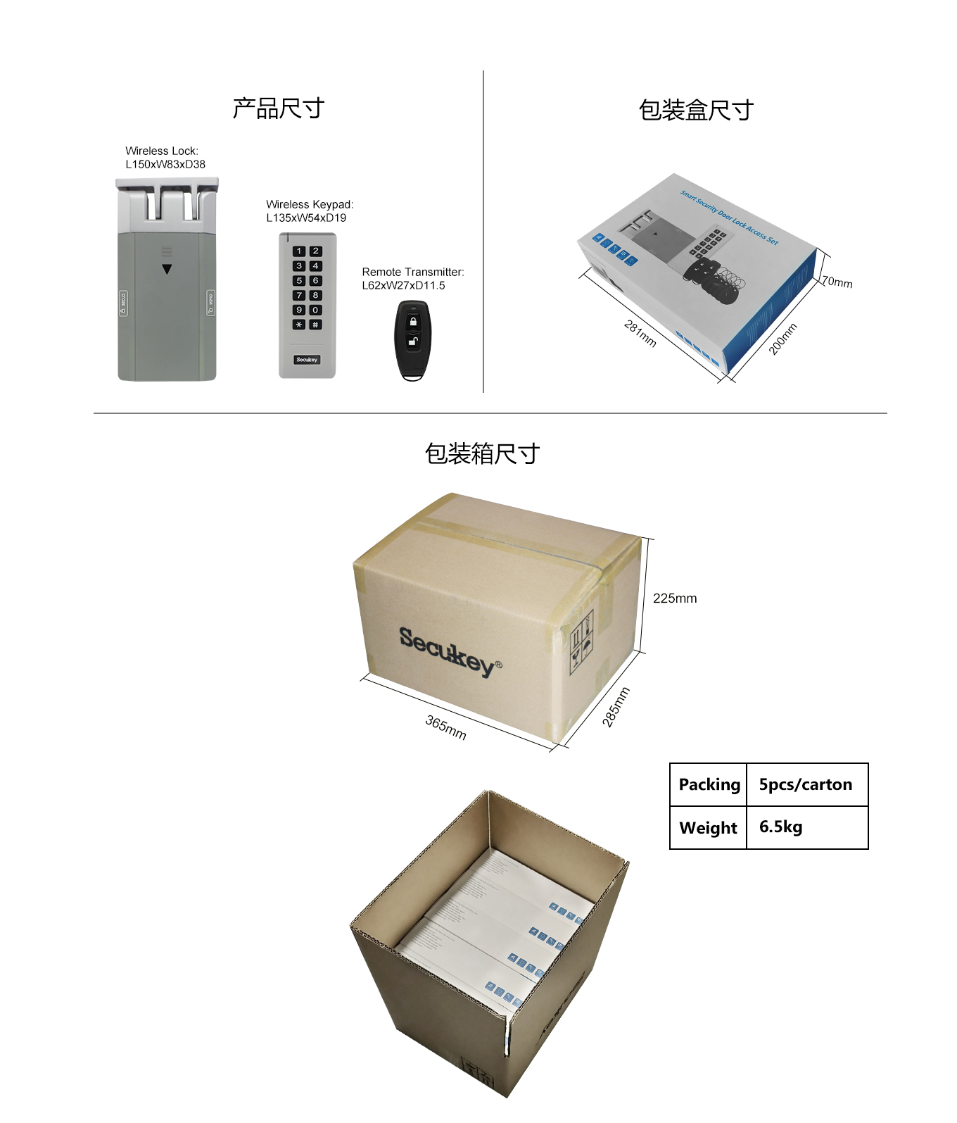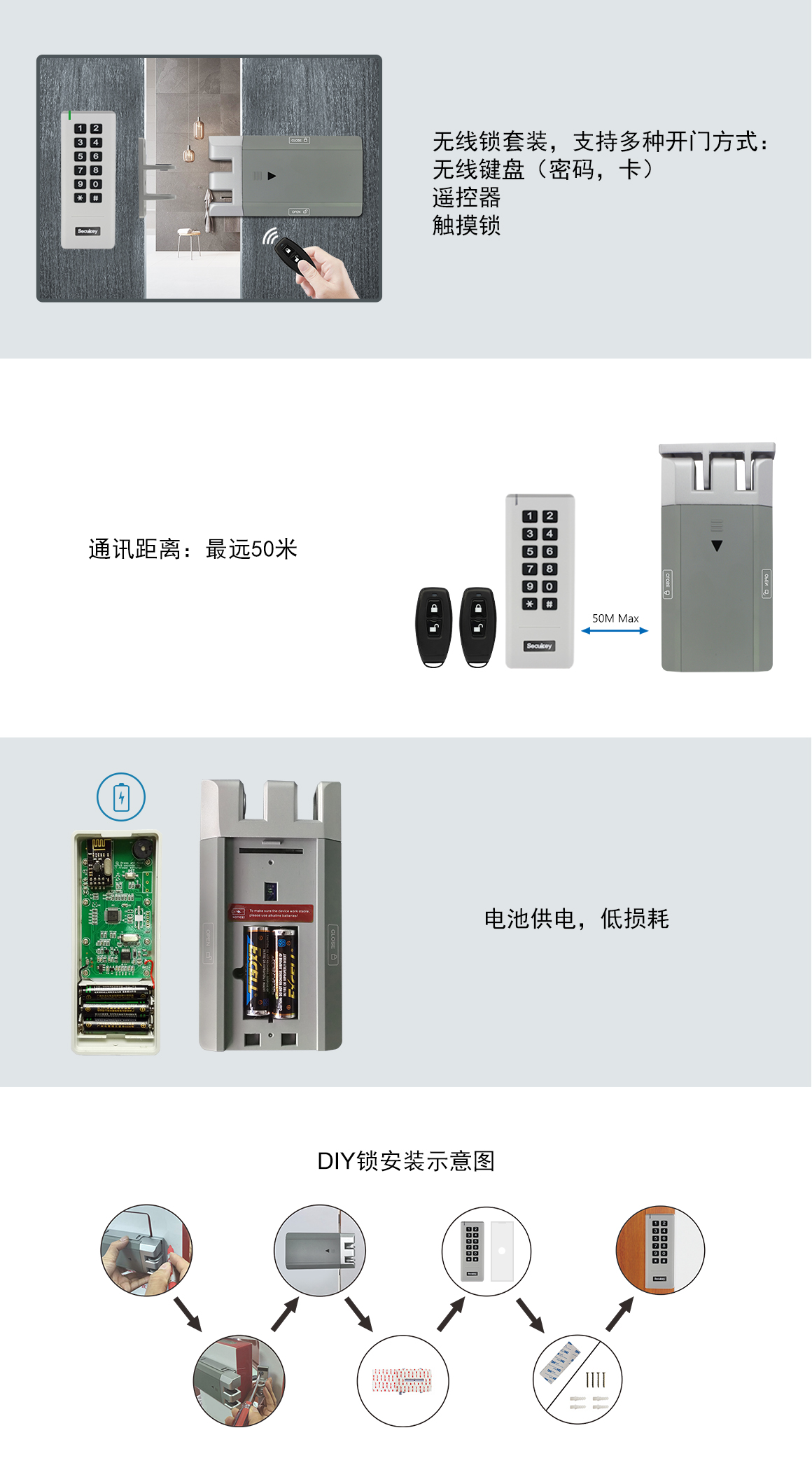 無線智能(néng)鎖套裝包含無線鍵盤機(jī)+無線鎖+2個(gè↓→≤)遙控器(qì)+5張RFID卡。