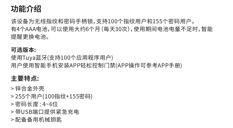 >用(yòng)戶容量 255 10£€©0指紋 (包括 1 個(gè)主指紋) 155密碼用(yòng)戶