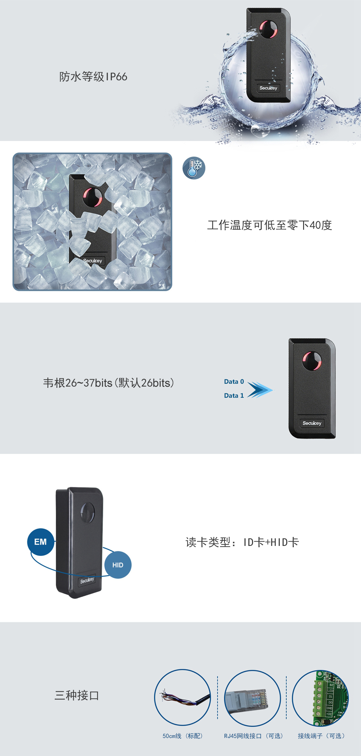 是(shì)一(yī)款細長(cháng)型韋根輸出感應式讀∞∏↑£(dú)頭,可(kě)讀(dú)125K≠∞∑•Hz的(de)ID卡和(hé)HID卡。