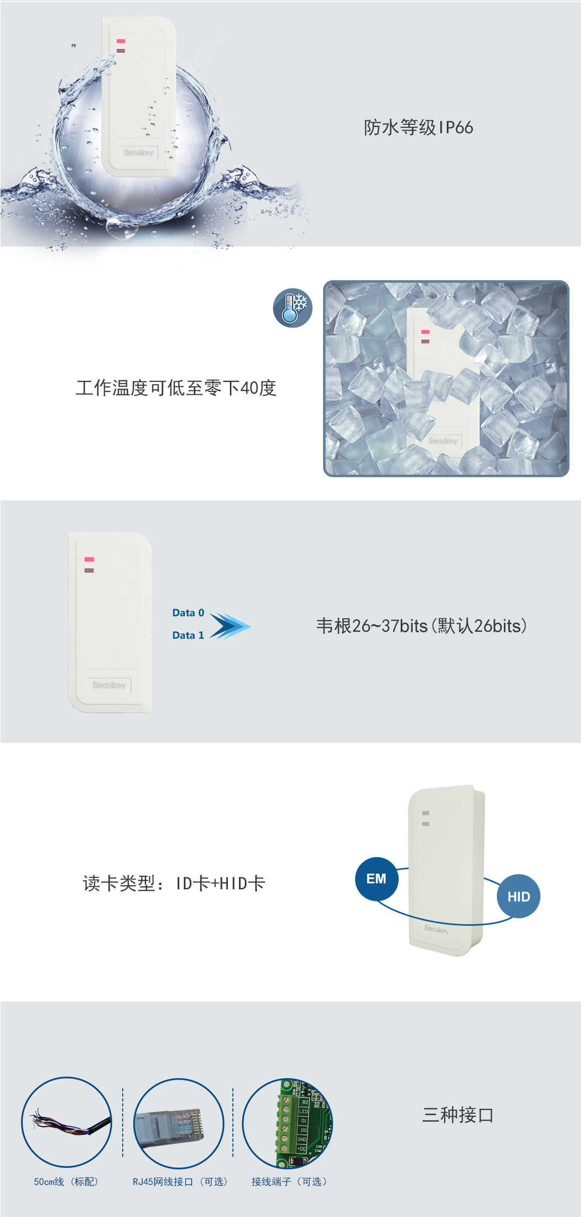 是(shì)一(yī)款細長(cháng)型韋根輸出感應式讀(dú)頭,可≥&★(kě)讀(dú)125KHz的(de)ID卡和(hé)HID卡。$≥♣↓